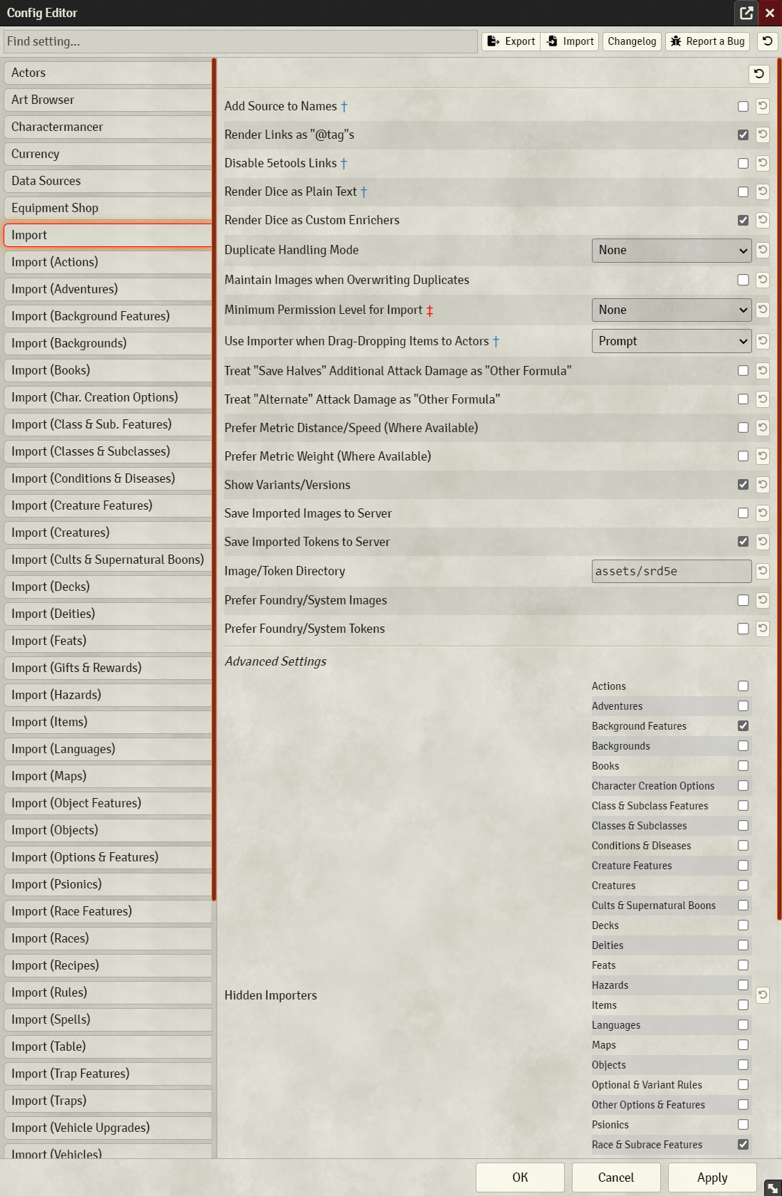 By default, the module imports data provided by 5etools, but also includes the option to import from the homebrew repository, the prerelease repository, URLs, and file uploads.